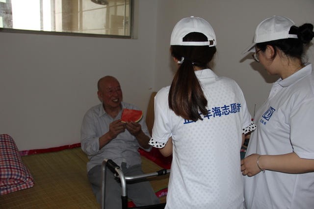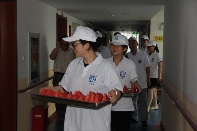 志愿者們為福利院的老人們送去西瓜、水蜜桃、飲料等消暑食品品,并將水果清洗、切分后一一分送到老人手中。大家和老人們親切聊天,叮囑老人們注意養身、保重身體,同時配合服務員一起整理內務、打掃衛生。志愿者服務活動為老人們送去關愛和快樂,贏得老人和管理人員的交口稱贊。