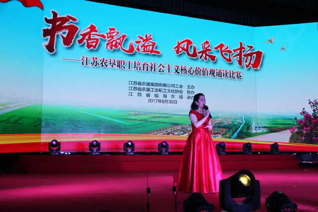來自墾區29家單位的50名參賽選手,誦讀了《祖國啊我親愛的母親》、《藤與瓜》、《流淌在心頭的一首歌》等29件作品。優秀的作品內容通過選手精彩的藝術表達,展現了新時期、新形勢下農墾職工的文化素養和蓬勃朝氣,令現場的每一位觀眾和評委深受感染,在蕩滌心靈,陶冶情操,享受藝術美的過程中,形象地感悟到社會主義核心價值觀的深刻內涵,也進一步激發了農墾職工對讀書的熱愛之情。江蘇農墾工會主席佟曉廷出席活動現場并講話。