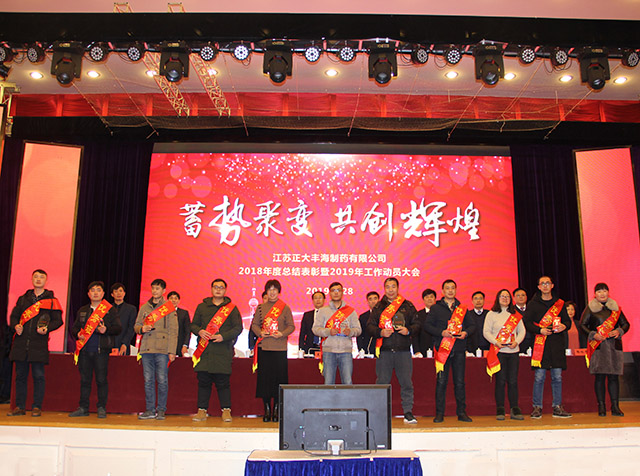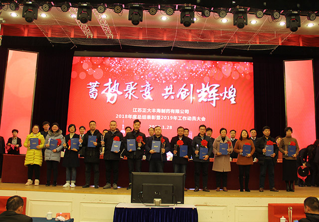 2019年1月28日下午,在大豐和平飯店三樓國際廳,一場關于正大豐海2018年度總結表彰暨2019年工作動員的盛會榮耀至歸。此次大會是正大豐海歷年來規模最大、參會人數最多的一次重要活動。大會圍繞“蓄勢聚變 共創輝煌”主題,總結經驗,表彰先進,謀劃未來。公司總經理夏文余,副總經理劉海華、徐俊福、呂燈勇、王振,總經理助理祁輝林,醫藥公司副總施衛凱、王素華、陶桂平等出席會議,新老廠區各系統、各部門人員,藥物研究院全員、先進集體(班組)代表以及先進個人等共計562人參會。